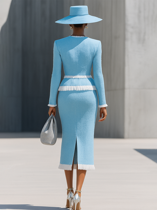 ÉCONOMISER [pourcentage]Ensemble élégant vintage en tweed à boutons dorés et à franges, composé d'un haut et d'une jupe.