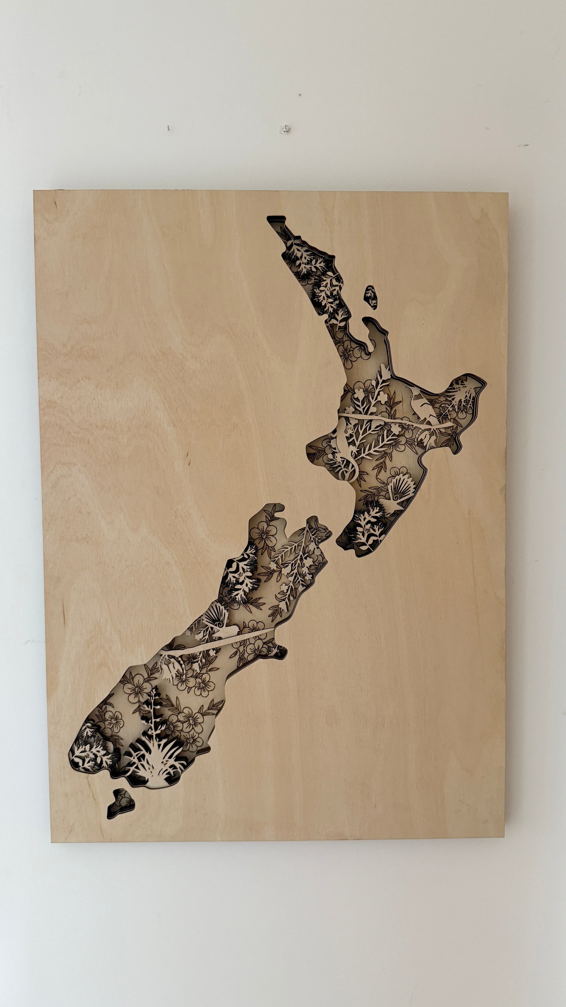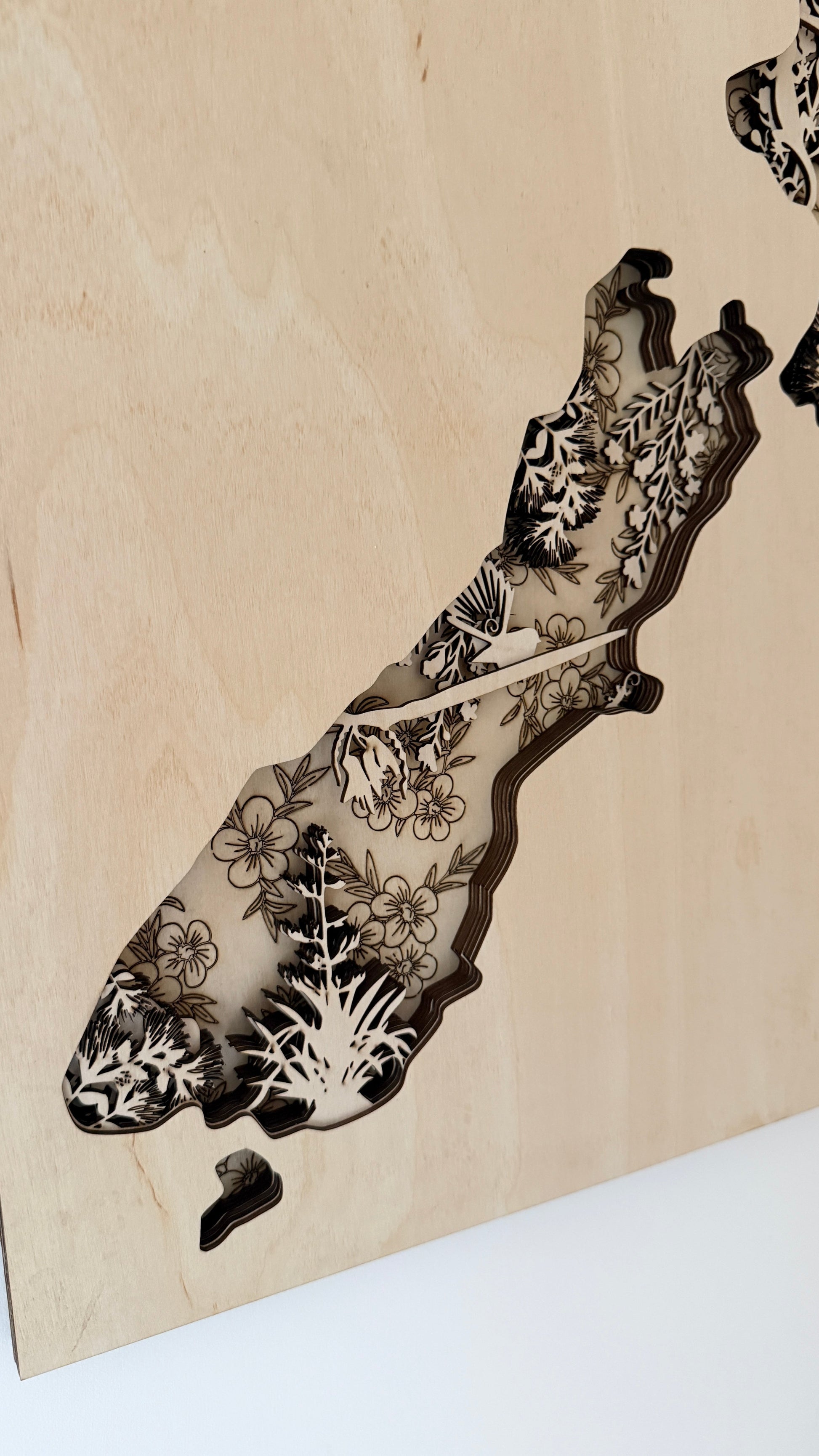 This stunning multi-layered 3D New Zealand Map is an exclusive Plazmart NZ original design. Featuring a rich tapestry of native flora and fauna – including the Fantail (Pīwakawaka), Tui, Kiwi, Flax (Harakeke), Kōwhai, Pohutukawa, Mānuka, and Kānuka – this piece beautifully honours the natural heritage of Aotearoa.