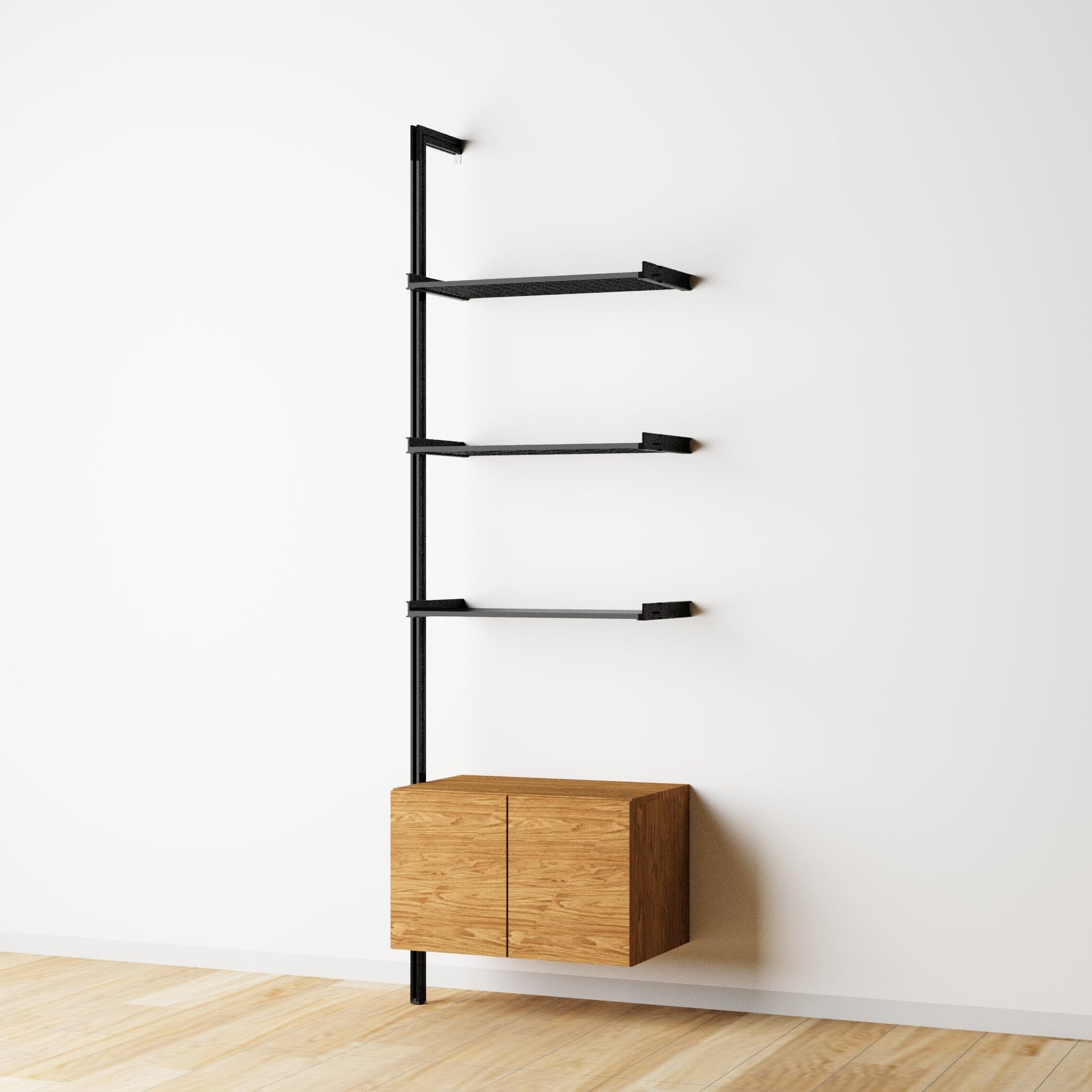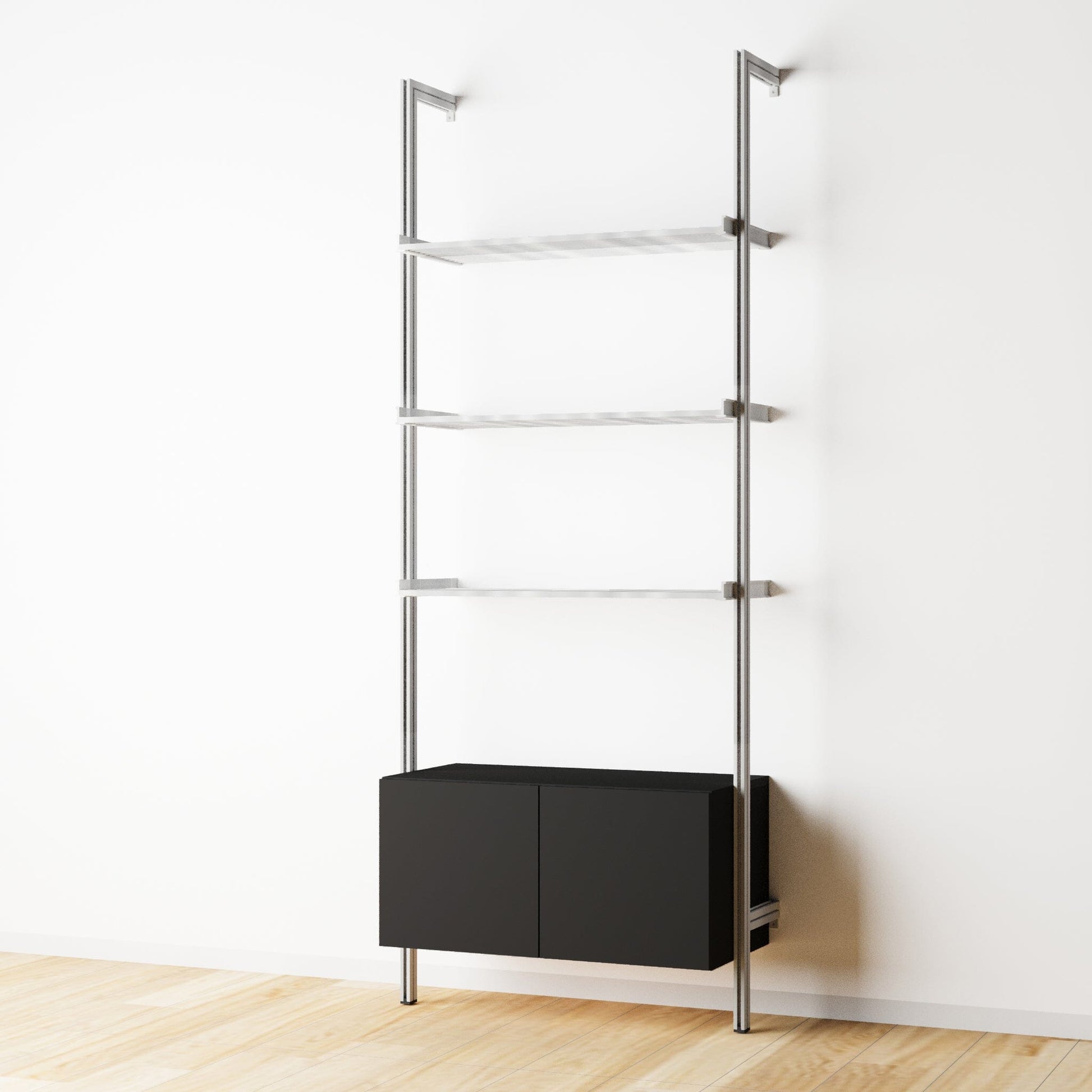 Transform your space with modular shelving that combines durability, style, and sustainability. Featuring anodized aluminum shelves and customizable wood cabinets, our system is designed to evolve with your needs.